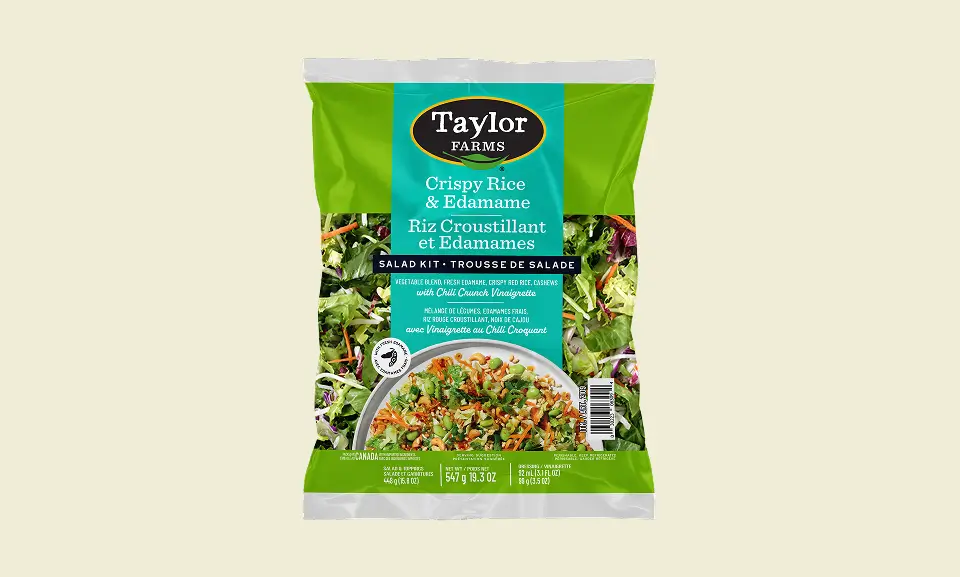 Delectable Asian flavors infuse this crunchy salad blend. Our Crispy Rice Edamame Chopped Kit tosses fresh vegetables (romaine, green cabbage, and carrots) with perky, high-protein edamame. Mix in crispy red rice and crunchy cashews, and drizzle the whole thing with chili crunch vinaigrette for some mild heat. This savory blend of textures goes especially well with grilled shrimp, seared salmon, or seitan.